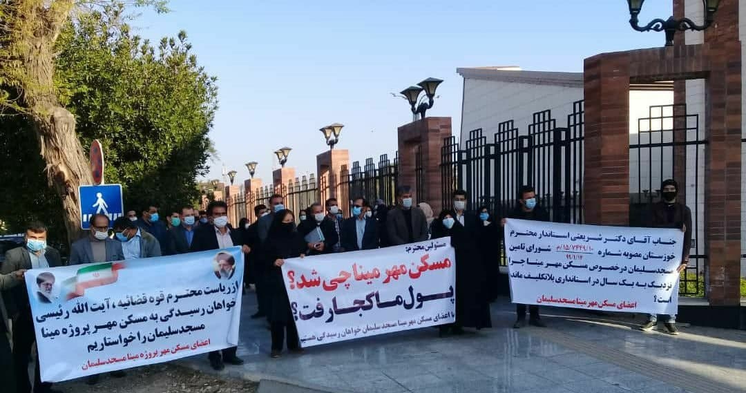به گزارش حقوق بشر در ایران به نقل از عصر جنوب، امروز سه شنبه ۳۰ دی ماه ۱۳۹۹، جمعی از اعضای پروژه مجتمع های مسکونی مینا وابسته به مسکن مهر در شهرستان مسجد سلیمان واقع در استان خوزستان، در اعتراض به عملکرد مسکن و شهرسازی و عدم تحویل واحدهای مسکونی آنها علیرغم گذشت چند سال در مقابل درب ورودی استانداری خوزستان تجمع اعتراضی برگزار کردند.